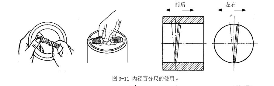 內徑百分尺上,沒有測力裝置,測量壓力的大小完全靠手中的感覺。測量時,是把它調整到所測量的尺寸后(圖3-11),輕輕放入孔內試測其接觸的松緊程度是否合適。一端不動,另一端作左、右、前、后擺動。左右擺動,必須細心地放在被測孔的直徑方向,以點接觸,即測量孔徑的最大尺寸處(最大讀數處),要防止如圖3-12所示的錯誤位置。前后擺動應在測量孔徑的最小尺寸處(即最小讀數處)。按照這兩個要求與孔壁輕輕接觸,才能讀出直徑的正確數值。測量時,用力把內徑百分尺壓過孔徑是錯誤的。這樣做不但使測量面過早磨損,且由于細長的測量桿彎曲變形后,既損傷量具精度,又使測量結果不準確。